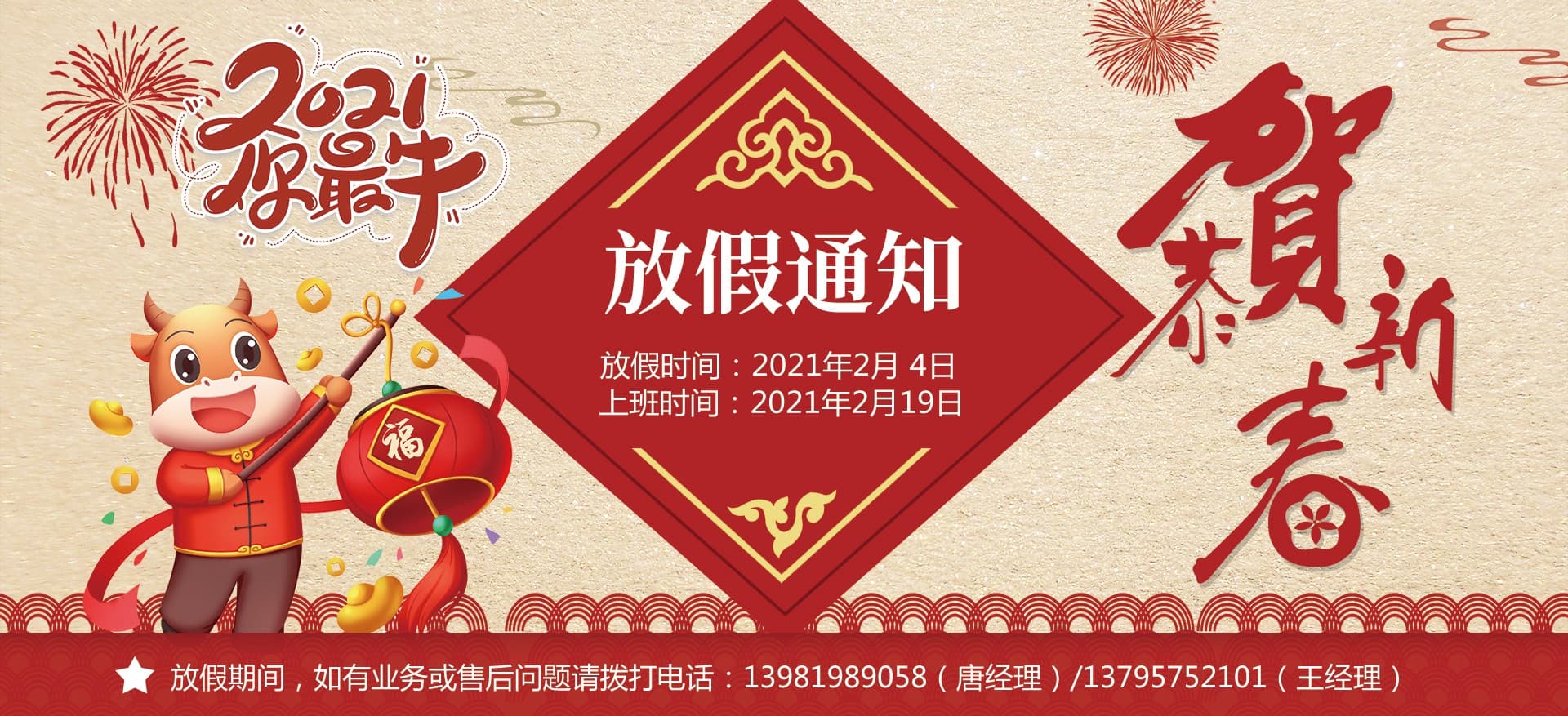 關(guān)于2021年春節(jié)假期安排的通知,結(jié)合我公司實際情況,經(jīng)研究決定,放假時間為:2021年2月4日——2月18日,共放假15天。2月19日(農(nóng)歷正月初八)正式上班。
