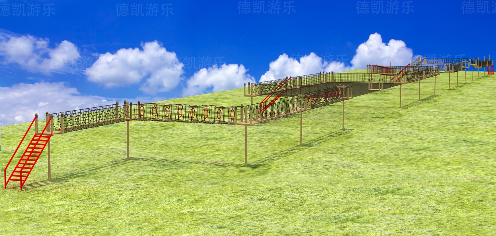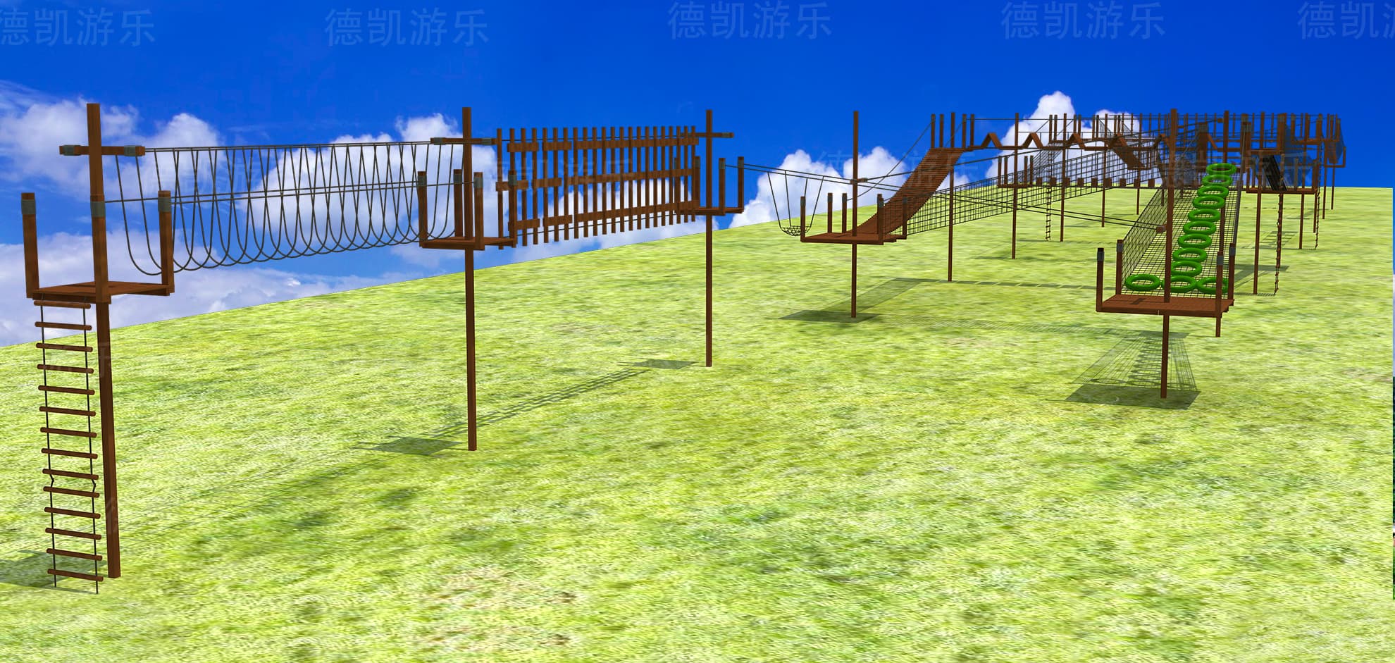 后面的拓展就包括了攀爬梯、U形橋、交錯(cuò)豎橋、空中滑索、輪胎橋、梅花樁等等,幾乎囊括了叢林穿越的大部分項(xiàng)目,降低了這個(gè)項(xiàng)目的危險(xiǎn)性,更加的適合年齡比較小的孩子們玩耍。