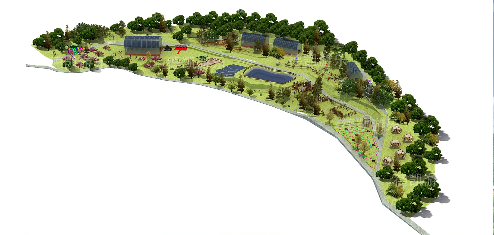 在總體效果圖里面,出來(lái)蔥蔥郁郁的植被,最顯眼的就是兒童游樂(lè)設(shè)備了。叢林里面散步的恐龍、幾個(gè)玻璃空間、拓展組合、鉆網(wǎng)滑梯、城堡滑梯、叢林滑梯、小迷宮等。因?yàn)閰擦种脖惠^密,所以能夠空間的游樂(lè)設(shè)備有限,而且效果圖整體較小,只能看見比較集中或者大型的游樂(lè)設(shè)備。