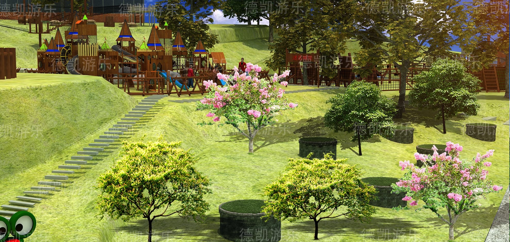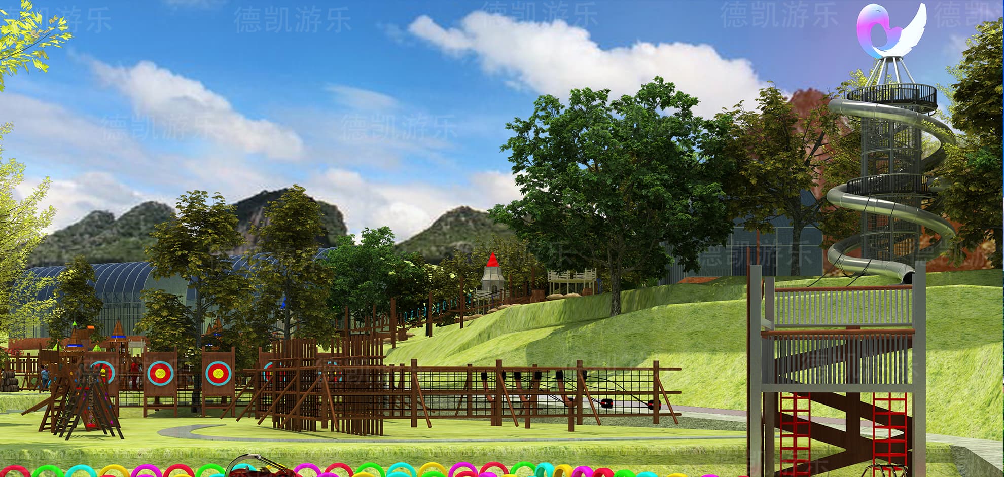 這個(gè)角度下的城堡是在大樹底下的,而且旁邊設(shè)置了拓展組合,至于拓展里面具體有什么項(xiàng)目有什么項(xiàng)目,就需要孩子們自己去探索了,介紹太多,只會(huì)讓客戶們覺得僅此而已,還不如讓他們自己探索。