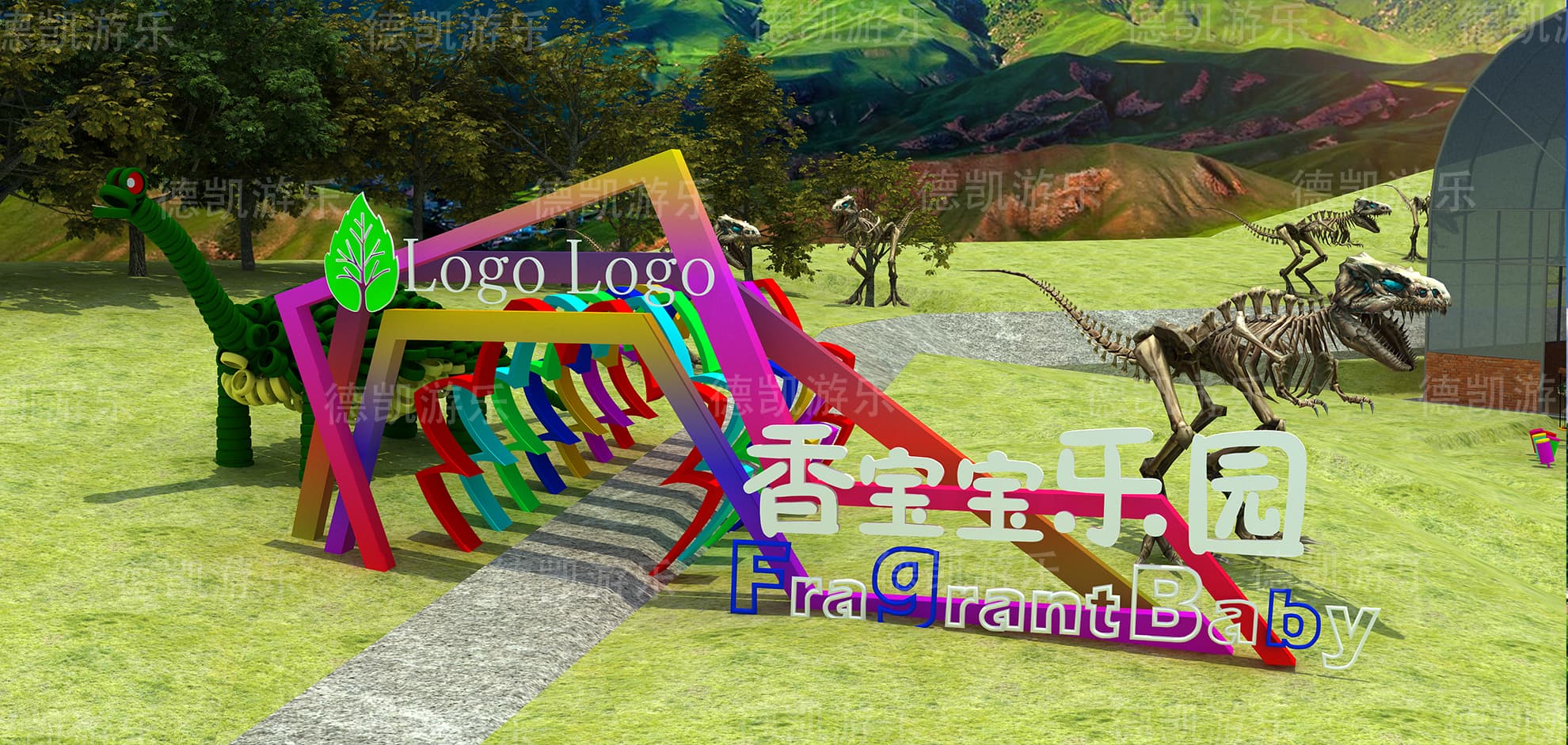 兒童游樂(lè)園的主要玩耍的人群是孩子們,因此吸引孩子們經(jīng)常來(lái)玩,大門的設(shè)計(jì)比較的可愛,融入了七彩,能夠很好地讓孩子記住這里,對(duì)增加孩子們的再次玩耍提高了幾率。門口周圍散步的恐龍骨架,會(huì)激起孩子們的好奇心,同時(shí)會(huì)加深對(duì)這個(gè)游樂(lè)園的印象,讓他們有再次進(jìn)來(lái)玩耍的意向。幾千萬(wàn)年生物的進(jìn)化是很難讓孩子們琢磨清楚的,恐龍的作用就是能夠讓孩子們有探索他們的好奇心,會(huì)增加他們對(duì)課外讀物的查閱,能夠很好地激起孩子們的好學(xué)之心。