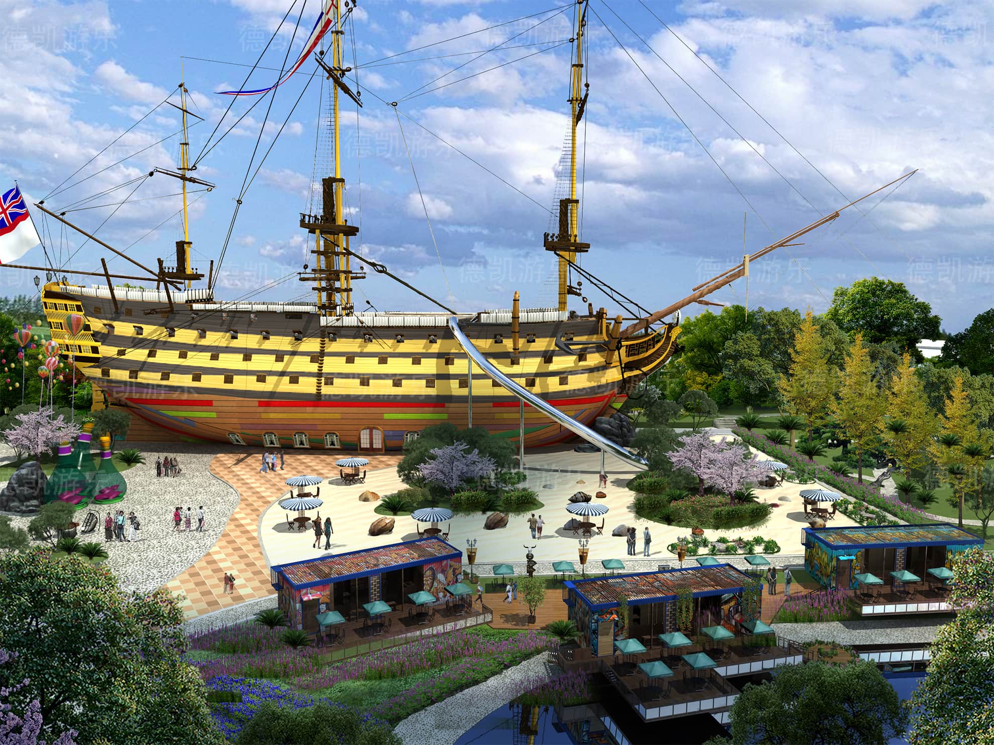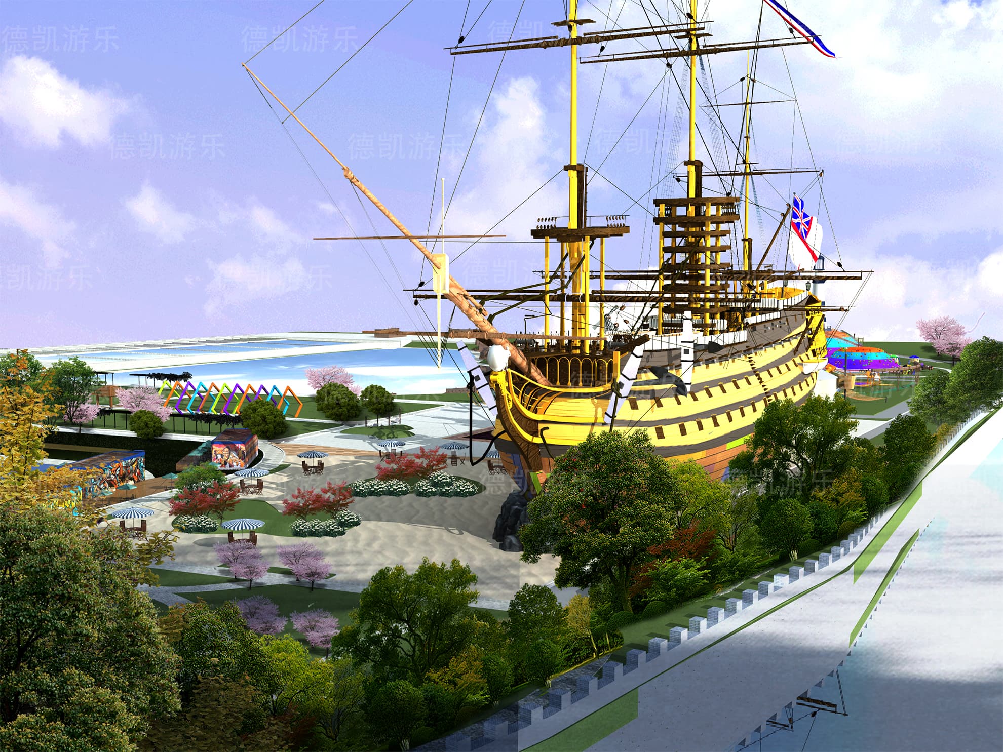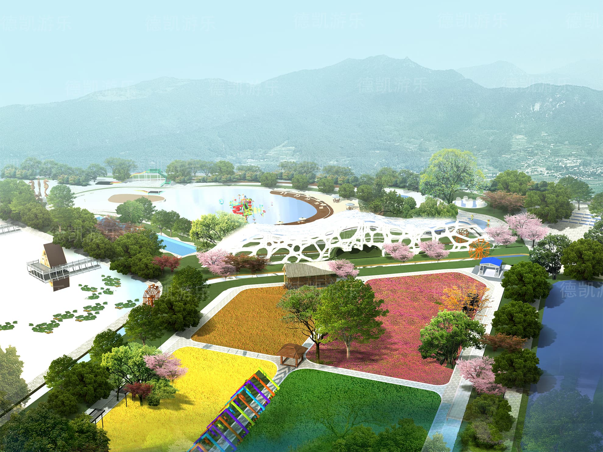 后期的效果圖是已經(jīng)比較完美的了,不僅是設施設備的完善還是整體規(guī)劃細節(jié),景觀性細節(jié)幾乎完美的效果圖,客戶可以從效果圖看到建成后的游樂園的整體效果,有利于客戶評估客源定位。