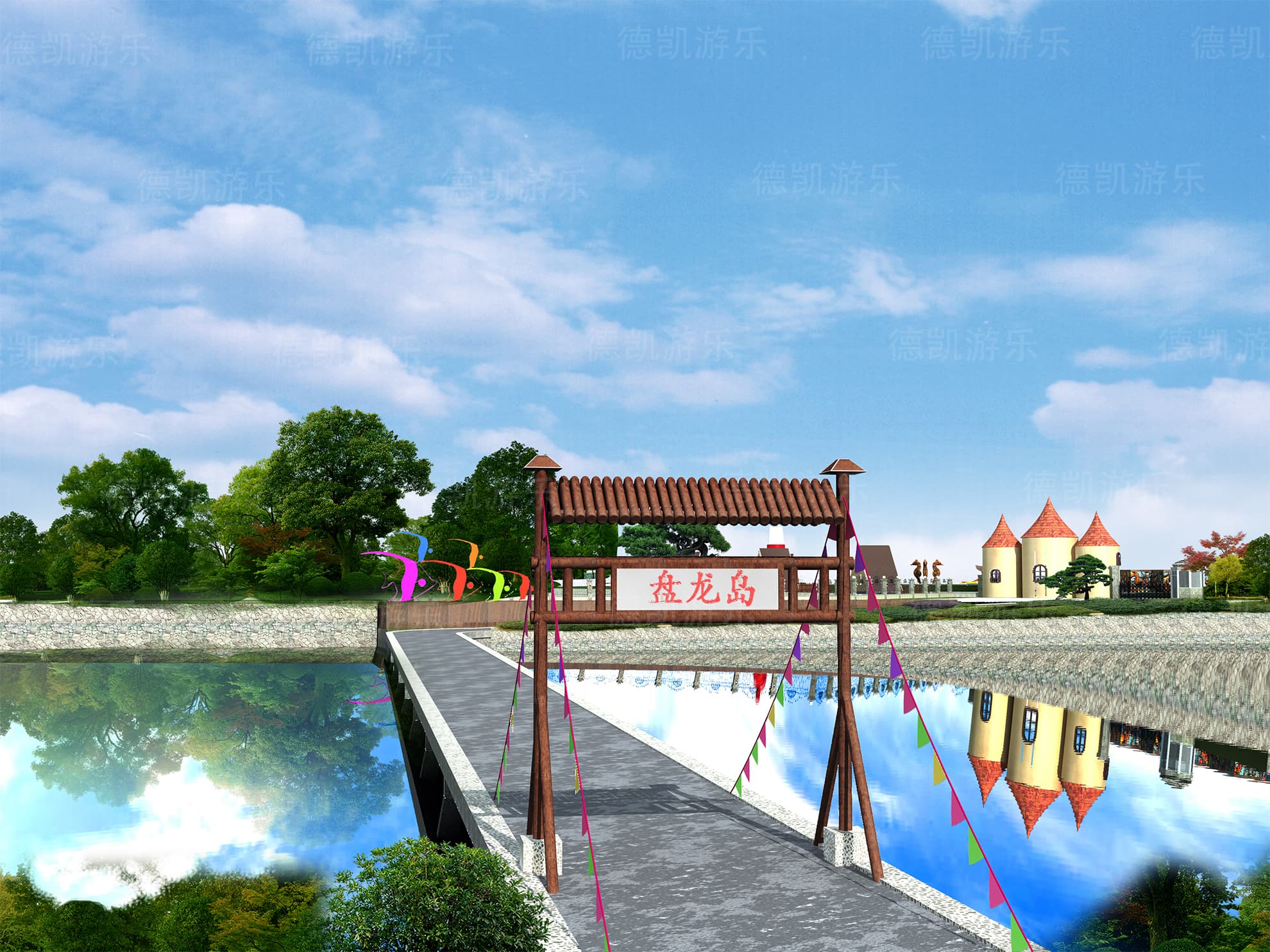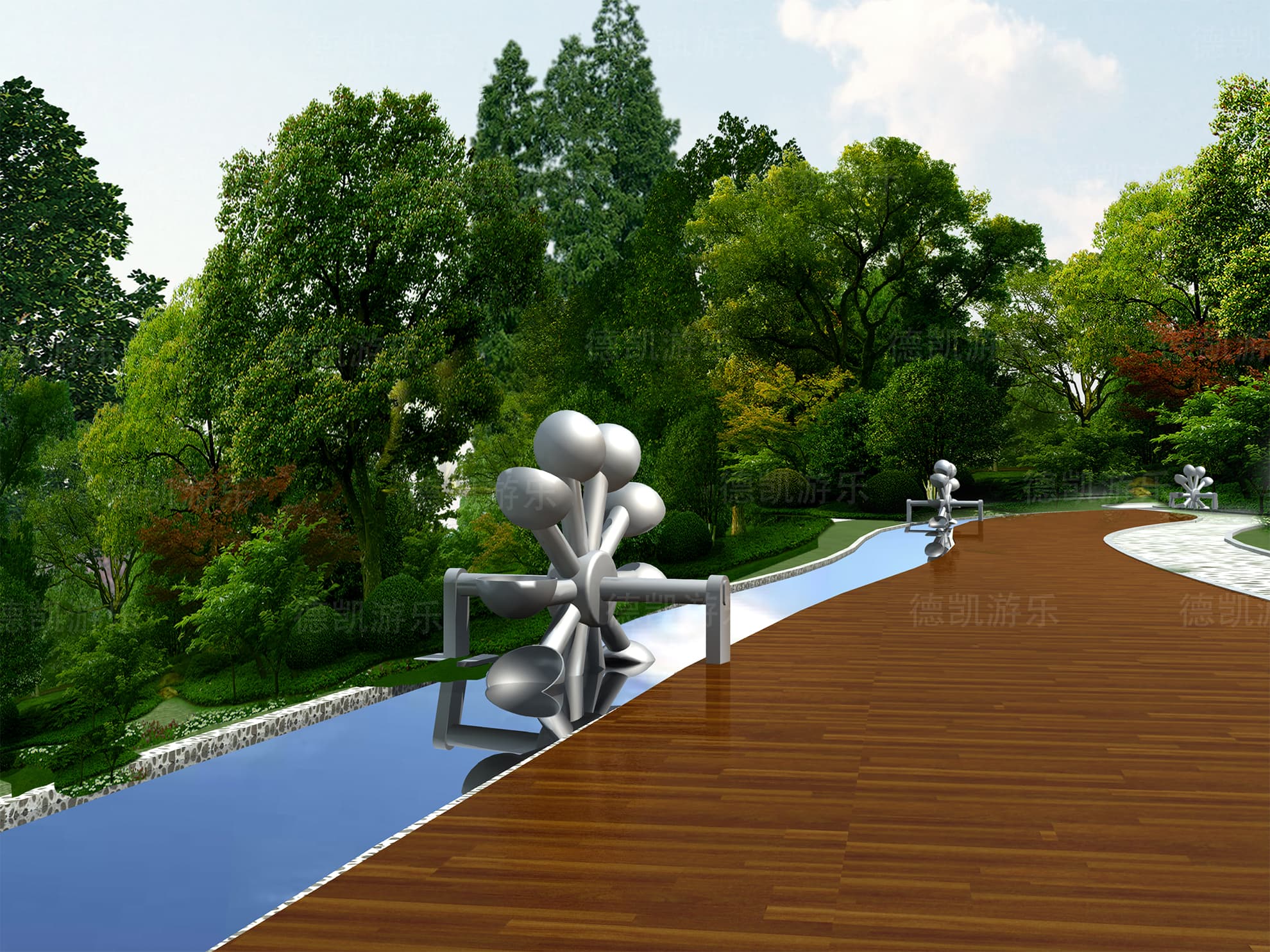 在這個角度看,整個項目完成后周圍環(huán)境就可以清晰的看見,因為主要修飾的是我們的設計部分,因此,設計區(qū)域的效果更好一些。彩虹門,水車又是激起孩子們探索興趣的寶貝,他們會歡快的穿過彩虹門,在小亭子休息一會會,趕緊又跑到又水車的地方,探索水車運轉的規(guī)律和樂趣。