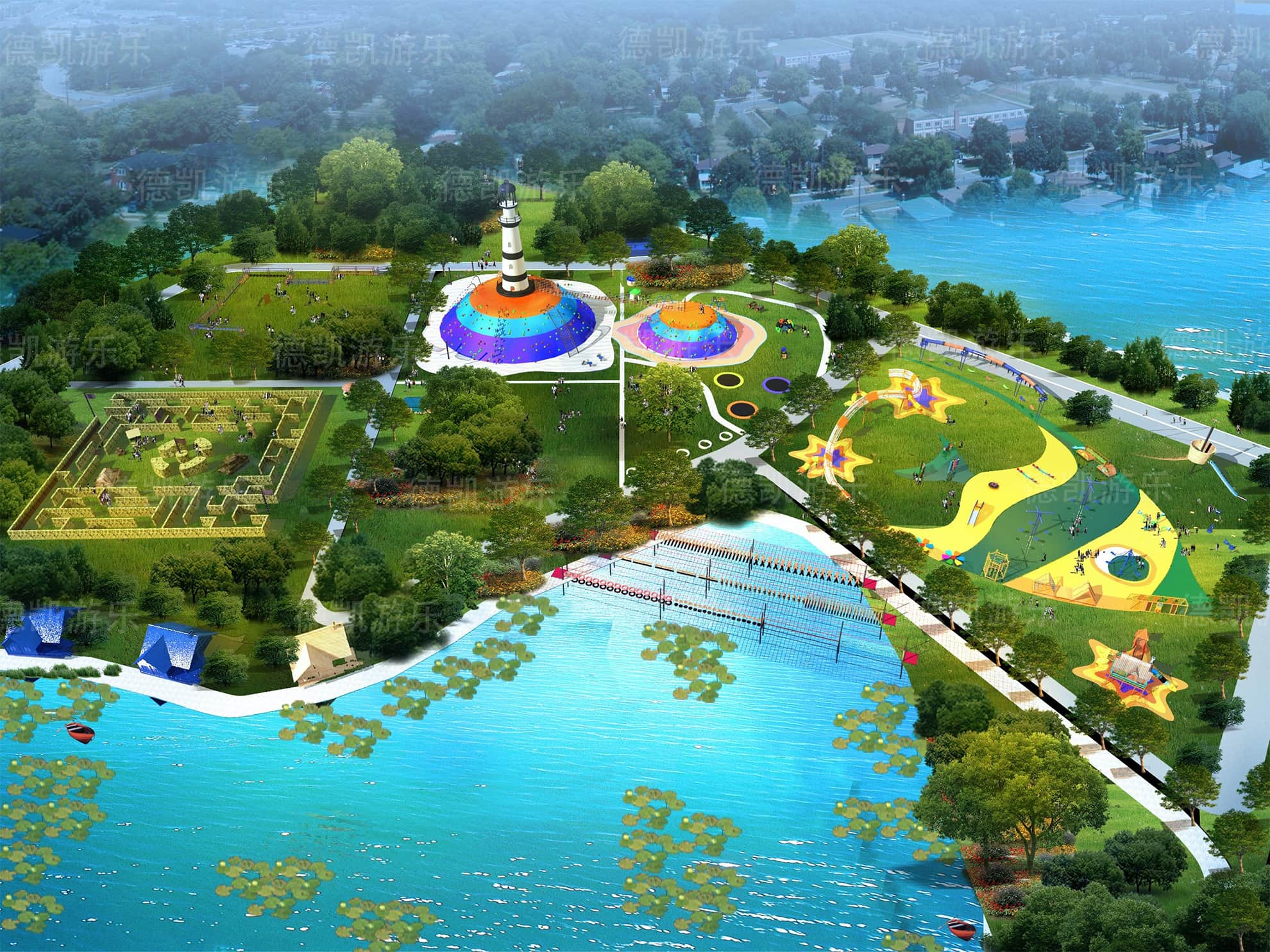 這部分主要呈現(xiàn)的是陸上無動力兒童游樂設備,主要的能看見的有迷宮、燈塔、蹦床、兒童拓展組合、水上蕩橋部分、弧形秋千、爬網(wǎng)木桶組合等。