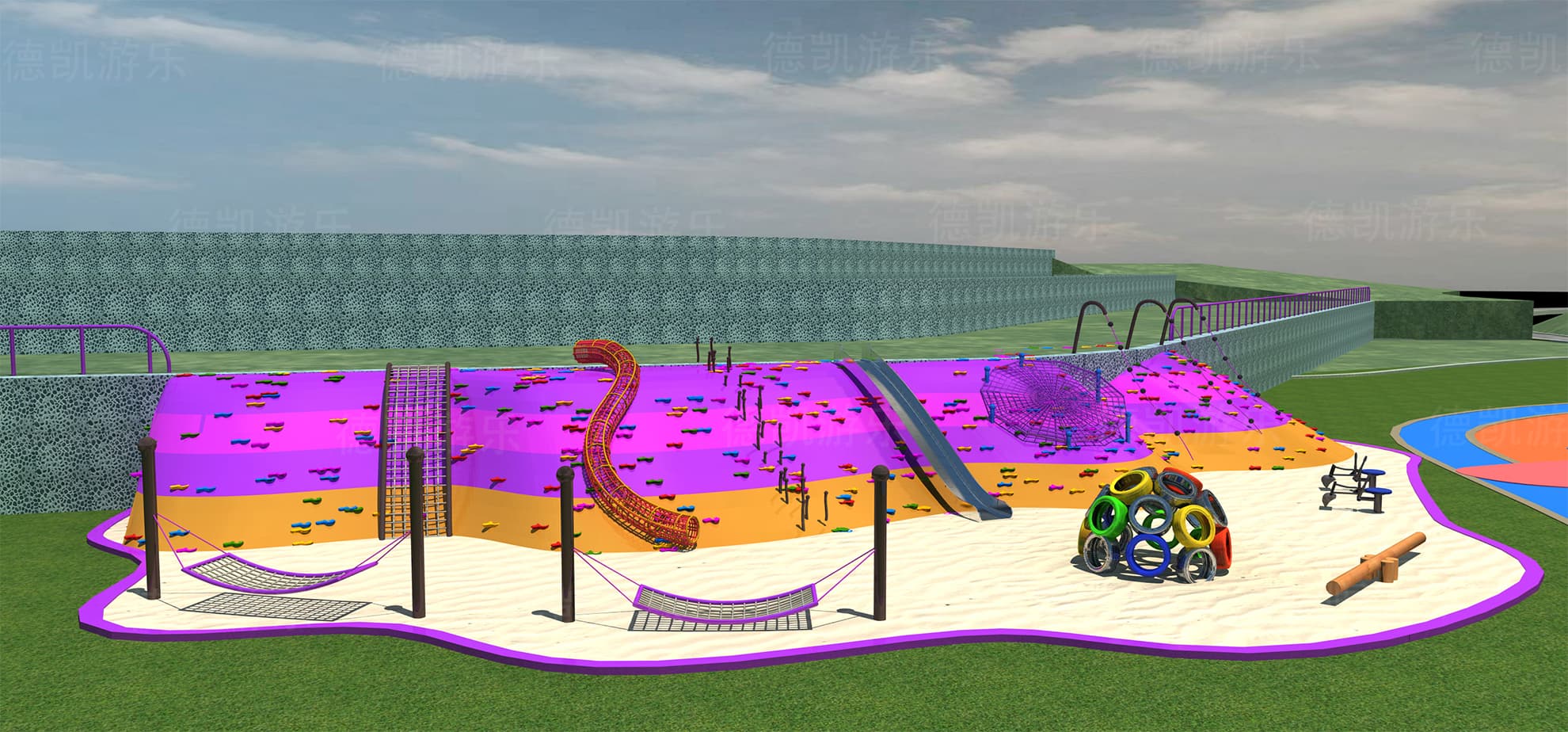 地形游樂區(qū)域是相對來說是造價(jià)最低,且功能最完善的區(qū)域了 ,集合了攀、爬、鉆、滑等功能,且對孩子們很友善,不會存在安全隱患。沙池里面也安置了一些小型的游樂設(shè)備,沙池秋千、輪胎組鉆網(wǎng)球、蹺蹺板、挖沙機(jī),給地形游樂區(qū)域增加新玩法,增加了區(qū)域的游玩性。絢麗的顏色也更加吸引孩子們的眼球,誘惑孩子們來這里探索玩耍。