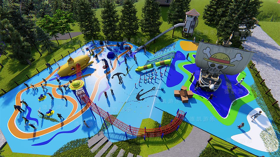 主要顯示海盜船和裝寶藏的箱子的細(xì)節(jié),間接顯示斜坡的傾斜度,斜坡上設(shè)備的細(xì)節(jié),還有遠(yuǎn)處草坪上充滿探險(xiǎn)滑梯。