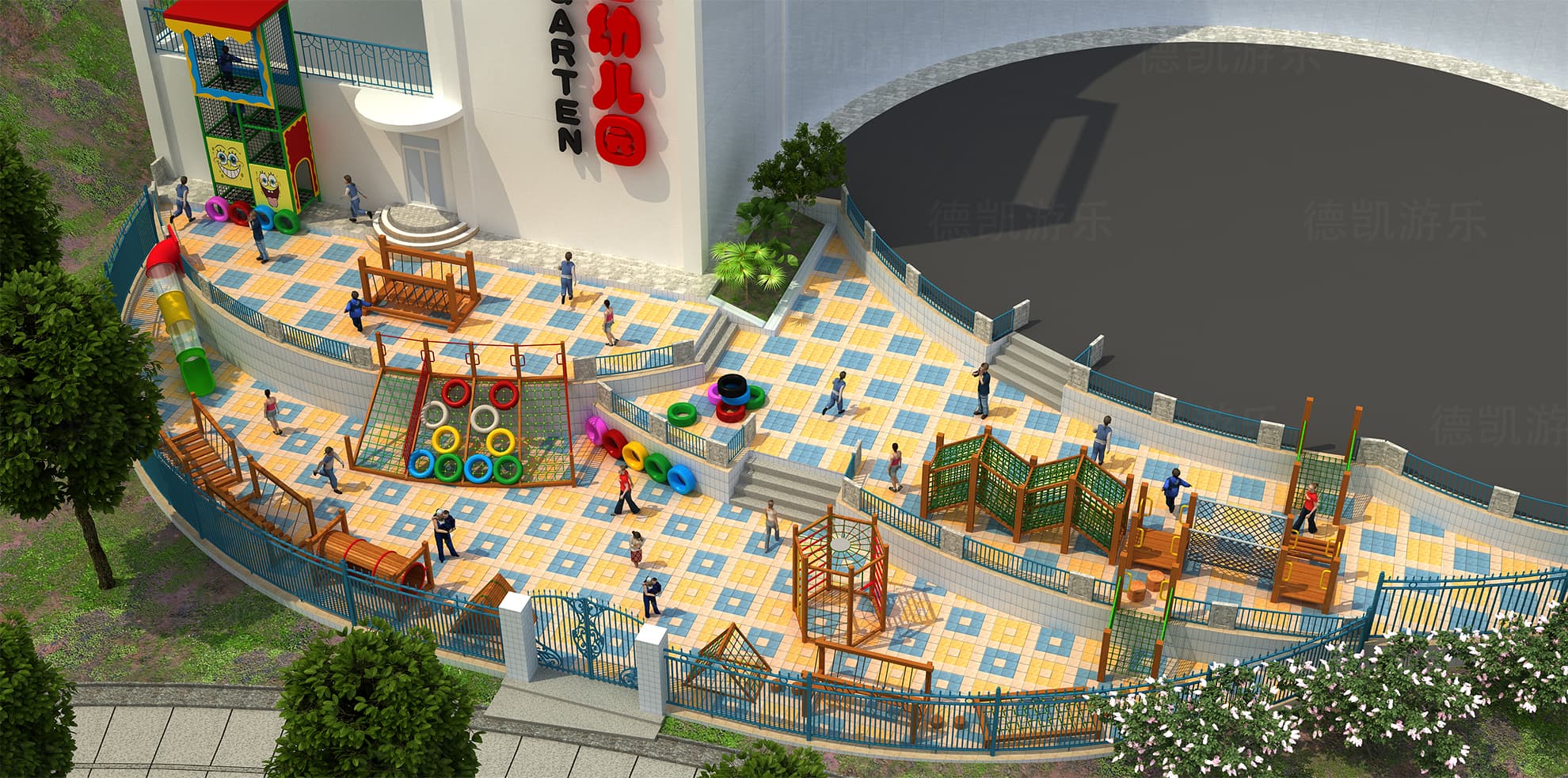 在俯視效果圖里面,我們可以看出整個園子的東西,木質拓展、爬網(wǎng)、滑桶、蕩橋等,一個個雅致的游樂設備點綴著單調的幼兒園。而且設備大部分的材料大部分都是木材,對于抵抗力弱的孩子們來說,健康、環(huán)保才不會對他們的身體健康造成負擔。就整體而言,設備比較簡單,挑戰(zhàn)難度不高,冒險性很低,很符合這個幼兒園的主要玩耍人群。