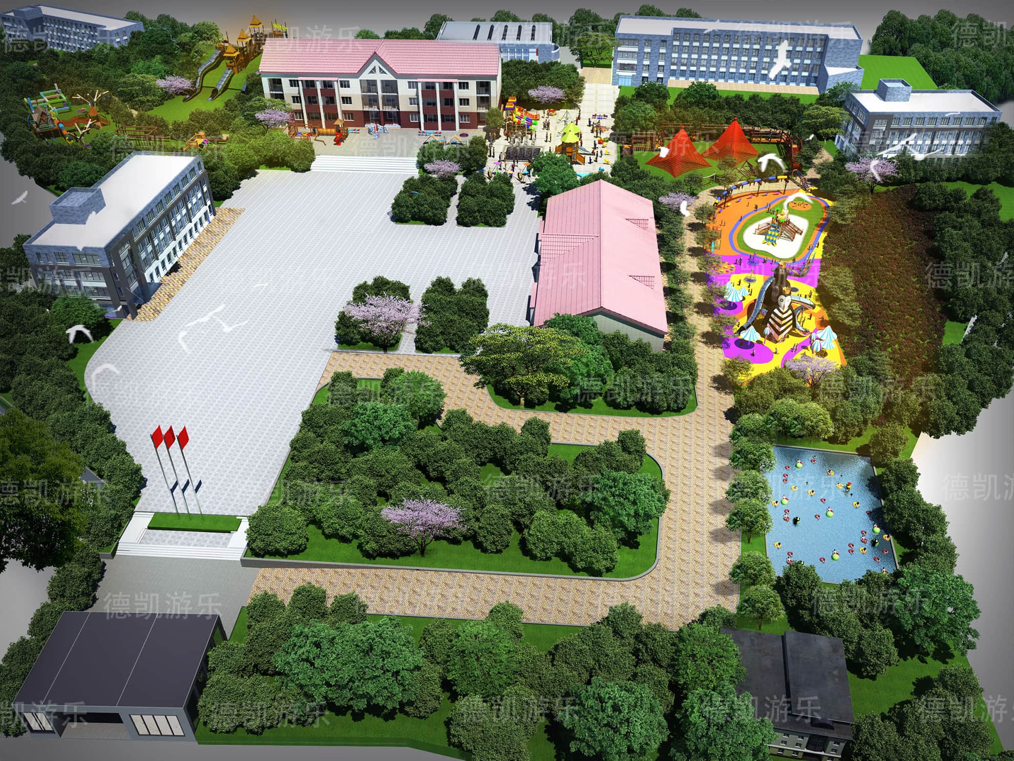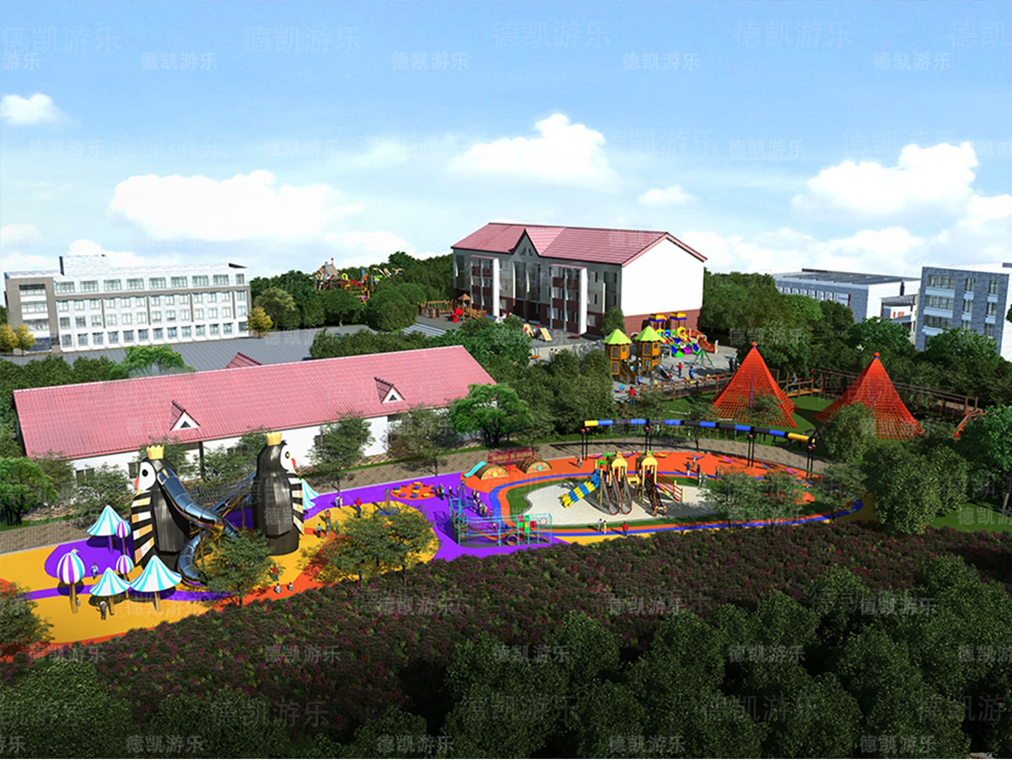 對于這個園子而言,它是屬于學(xué)校配套了,它里面的設(shè)備對孩子們的年齡段就沒有那么大了,年齡段應(yīng)該在2-15為主,可以包括幼兒園、小學(xué)、初中。在下課之后,游樂區(qū)域會擠滿了孩子們的身影,他們在這里追逐、打鬧,玩耍,爭分奪秒地過著下課時間。在這個效果圖里面,完全可以看見企鵝滑梯、組合滑梯、城堡滑梯、勇攀高峰等比較大型的游樂設(shè)備,從周圍環(huán)境可以清晰的看見許多的教學(xué)樓,因此這個學(xué)校的孩子數(shù)量就會相對來說比較的多,這些游樂設(shè)備能夠得到很好的利用。
