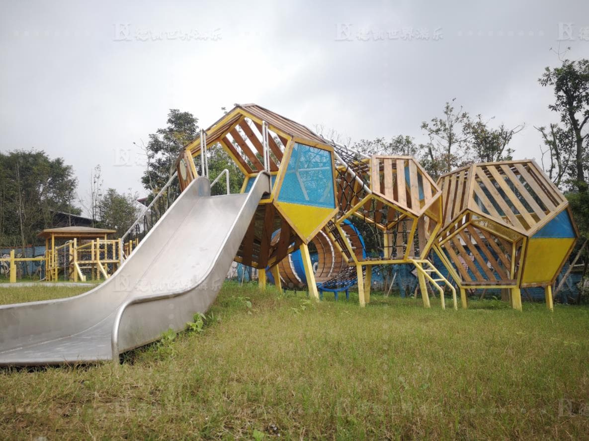 這個(gè)游樂項(xiàng)目把攀爬網(wǎng)和高空旋轉(zhuǎn)滑梯組合在一起,迎合了孩子們愛探險(xiǎn)的天性,高處是一個(gè)由玻璃制作而成的區(qū)域,能讓孩子們體驗(yàn)到站在高空中的刺激感,高空旋轉(zhuǎn)滑梯帶孩子們感受冒險(xiǎn)的快樂。